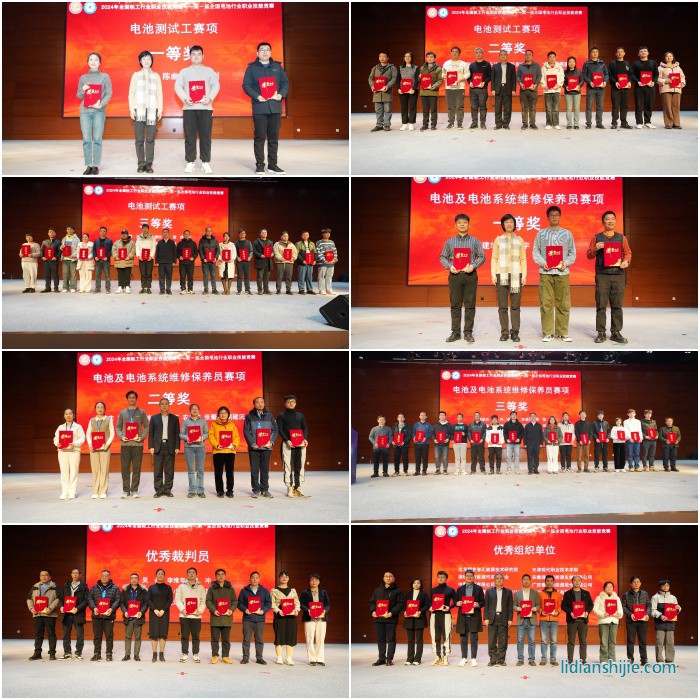 經(jīng)過激烈角逐,電池測試工賽項,譚婷、陳幽岐、侯寶剛3名選手獲得一等獎,黃湘鎮(zhèn)等12名選手獲得二等獎,耿祥熙等15名選手獲得三等獎。電池及電池系統(tǒng)維修保養(yǎng)員賽項,韓建華、米笑宇、馮培基3名選手獲得競賽一等獎,陳培慶等7名選手獲得二等獎,陳洪杰等15名選手獲得三等獎。與會領(lǐng)導(dǎo)為獲獎選手、優(yōu)秀裁判員和優(yōu)秀組織單位現(xiàn)場頒發(fā)榮譽證書。